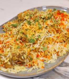 Aromatic and spicy chicken biryani served with a refreshing mint sauce.