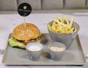 a grilled chicken patty, jalapenos, lettuce, onions, and our spicy dip sauce, topped with our signature sauce
