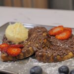 Golden brioche slices fried in butter, served with maple syrup and fresh strawberries.